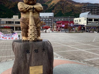 無料の足湯。入り口に寝そべってくつれーどる鬼どのが。