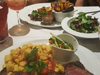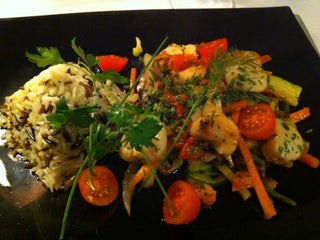 Chicken breast with mostard sauce and french fries with bacon. Tagliatelle with shrimp was also good. Fancy and cosy place.