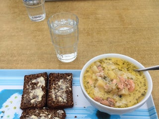 Awesome salmon soup with bread and coffee 8€
