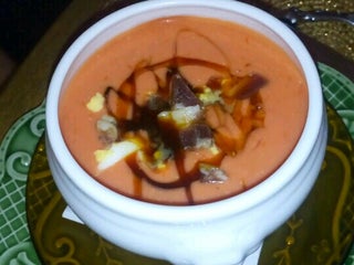 Ensalada de Pera y Gorgonzola, Croquetas de Bacalao, destacaría la Pluma Ibérica con Sopa de Torta del Casar. En los Postres abusa de la galleta en la confección de las tartas. La camarera impecable!