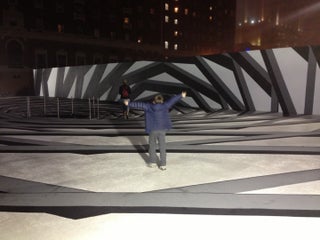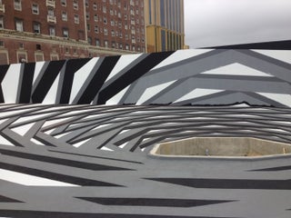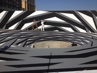 Étude Atlantis forms an elaborate, illusionistic space in which bold linear stripes converge into a spiral pattern. A cistern, carefully crafted from sheets of mirror, occupies center of the spiral.